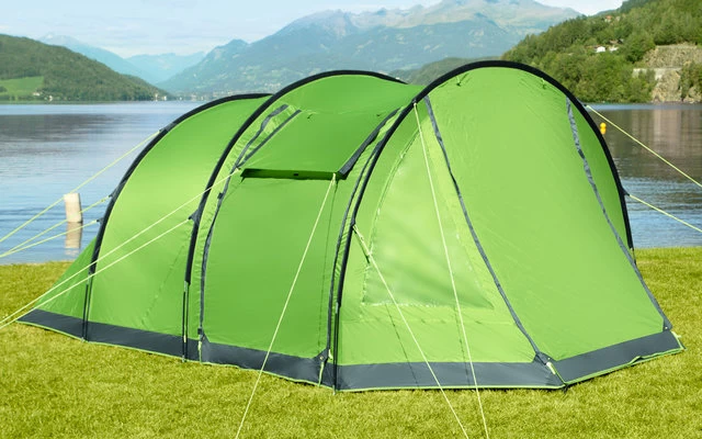 Tunnelzelt mit 3 doppelten Eingängen (zusätzliche Moskitogaze-Türen), welche als Sonnendach ausstellbar sind. Gegenüberliegende Seiteneingänge verfügen über zusätzliche, verschließbare Lüftungsfenster. Die Sichtfenster im Eingangsbereich sind von innen blickdicht verschließbar. Die fest eingenähte Bodenplane sorgt für zusätzlichen Komfort. Schlafkabine mit Moskitogaze-Tür (von innen blickdicht verschließbar) und praktischen Organizern. Zeltlampenaufhängung im Dachbereich. Doppelt abgedeckte Reißverschlüsse. Von außen verschließbare Dauerbelüftung hinter der Schlafkabine. Die komfortable Stehhöhe beträgt 200 cm.