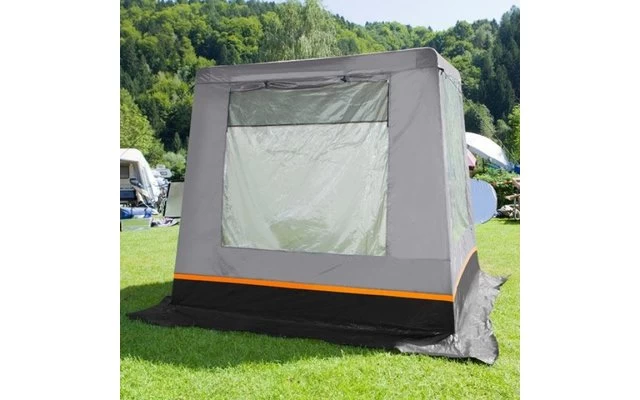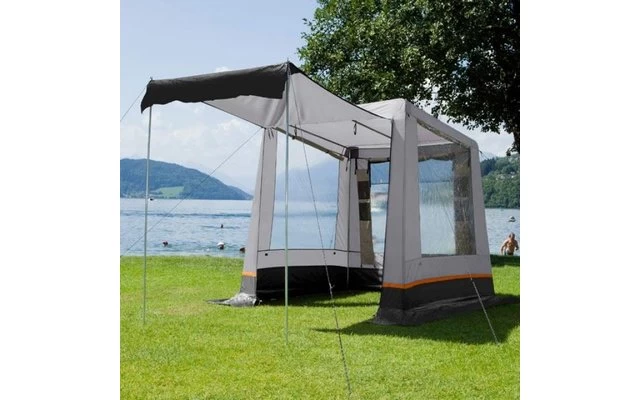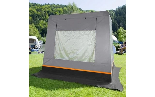 Verschließbare Hochentlüftung an der Vorderwand. Eingang als Sonnendach ausstellbar. Moskitogaze-Belüftung an der Rückwand (von außen verschließbar). Innen angebrachte Abdeckklappen für alle drei Fenster.
