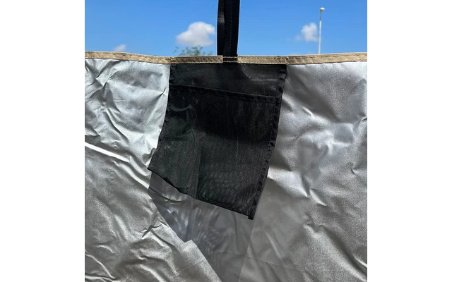 Die Duschkabine verfügt über zwei seitliche Reißverschlüsse, die den Zugang zum Innenraum ermöglichen, sowie über zwei Seitentaschen, in denen sich allerlei Dinge wie Seife oder eine Uhr während des Bades verstauen lassen.