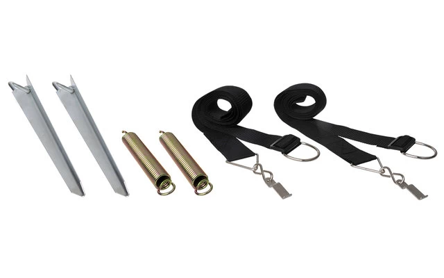 Im Lieferumfang sind 2 Gurte, 2 Stahlfedern und 2 stabile Heringe für ein perfektes Abspannen.