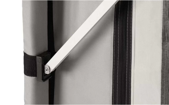 Perfekte Dachabdichtung dank Klemmprofilen für das Anbringen der Seitenwände und deren Verbindung mit dem Markisenstoff. Vorder- und Seitenwände sind mit schwarzen Doppelprofilen für optimalen Verschluss versehen.. Die Vorderwand besitzt eine Türöffnung rechts, die praktisch hochgerollt werden kann. Schaumstoffstreifen für winddichte Passung an der Fahrzeugwand. Große Fensterflächen lassen viel Licht herein und vermitteln ein richtiges Draußengefühl. Beide Seiten und die Vorderwand bestehen aus hochwertigem Polychlorid-Material. Weiteres Zubehör kann an der Keder-Schiene an der Vorderwand des Zelts angebracht werden. Eine Bodenschürze zur Abdichtung Ihres Fahrzeugbodens gehört zum Lieferumfang.